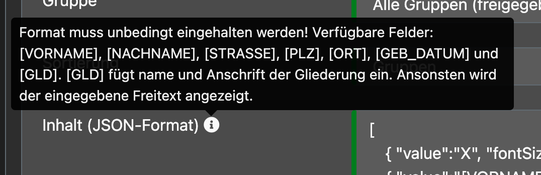 "Wochentag (für Anzeige)" ist ein freies Eingabefeld, das genutzt werden kann, um auf der Webseite kompliziertere Wochenrhythmen für Trainingsgruppen zu beschreiben. (z.B. "jeden Montag und jeden zweiten Dienstag")