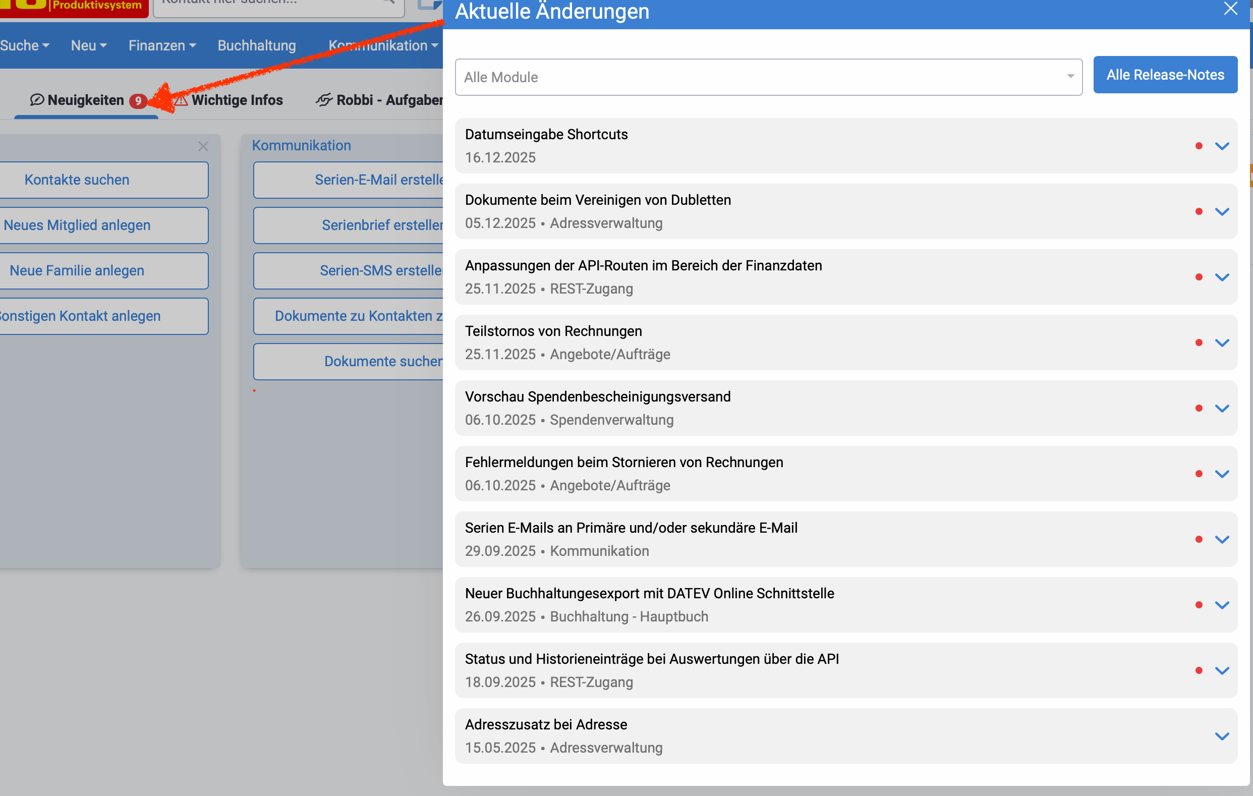 Die Mitteilungen sollten regelmäßig gelesen werden, da sie unmittelbare Auswirkungen auf Ihre Arbeit im System haben können.